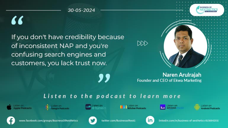 Host Ryan Davies welcomes guest Naren Arulrajah for a discussion on NAP consistency, a critical factor for local SEO, especially for aesthetic practices. NAP stands for Name, Address, and Phone Number, and keeping it consistent across online listings is crucial for good search engine ranking and building trust with potential patients.